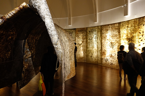 Musée Guimet : Des vues de nature, très poétiques qui ne répondent pas aux canons de la représentation du paysage. Témoin de la disparition d’une riche zone humide d’un faubourg de Calcutta et de son urbanisation, Jayashree Chakravaty, née en 1956, réalise une vaste installation à l’aide de toiles dans lesquelles elle glisse du coton, des feuilles, de racines, des graines séchées, de l’argile, des papiers, des perles de verre, etc.
