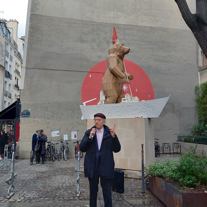 On n’imagine pas un vernissage sans discours. Au Socle, tout est différent. D’abord parce que c’est sur l’espace public, donc ouvert à tous. Ensuite parce que cette œuvre sortait de l’ordinaire, avec le poème peint sur le mur et l’ourse dans sa barque. Il y en eut quatre, celui de Michel, l’administrateur qui accueillit l’animal, celui de Francis qui lut le poème en français, celui de Joséphine, la très précieuse traductrice en anglais, Oriol un de nos amis artistes avec son poème en espagnol.